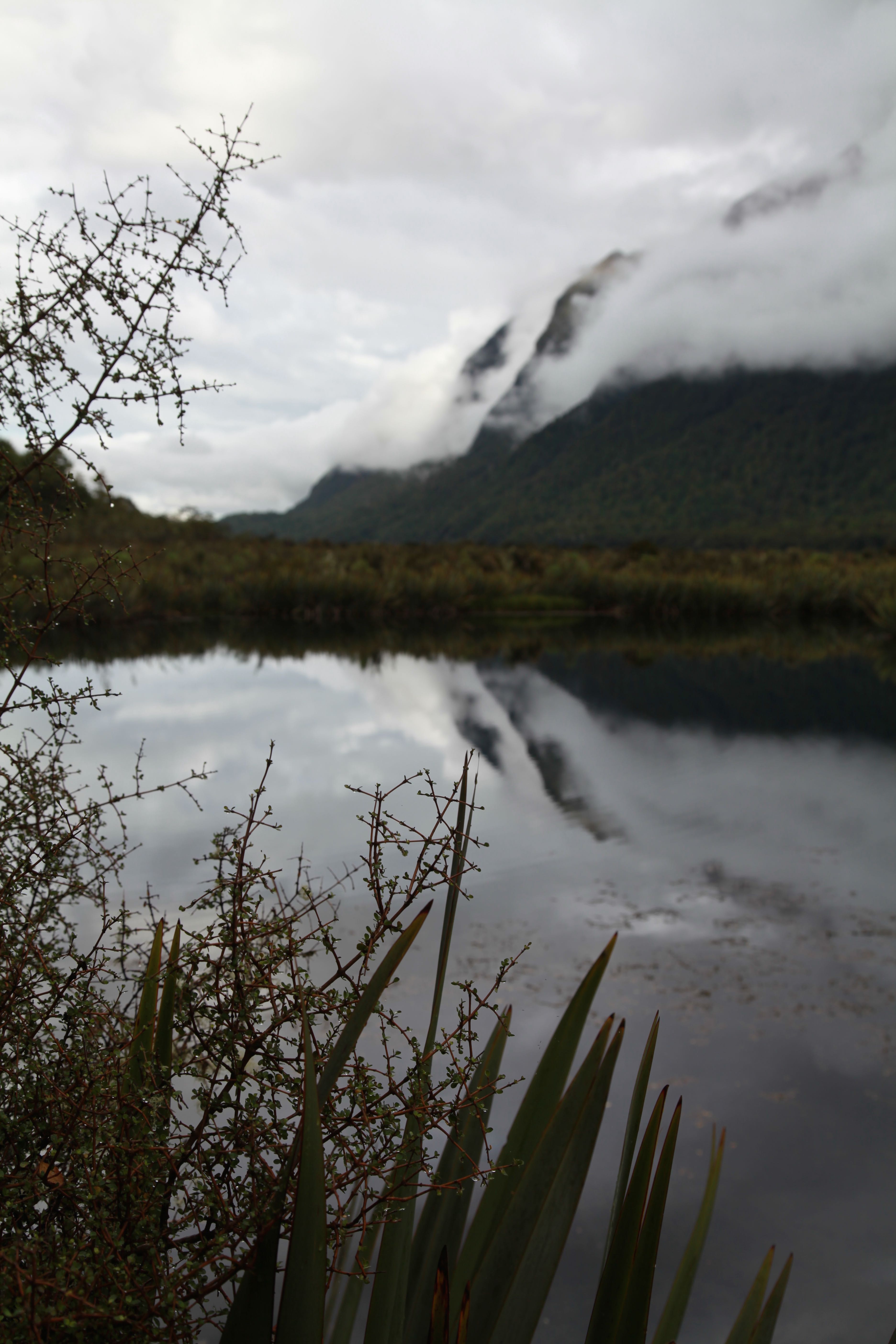 The tour bus to Milford Sound picks me and we set off on the road, making the obligatory photo and toilet stops. Fields of invasive lupins, swathes of yellow gorse, mountain reflections in what is no more than a pond. The rain is creating waterfalls by the minute.