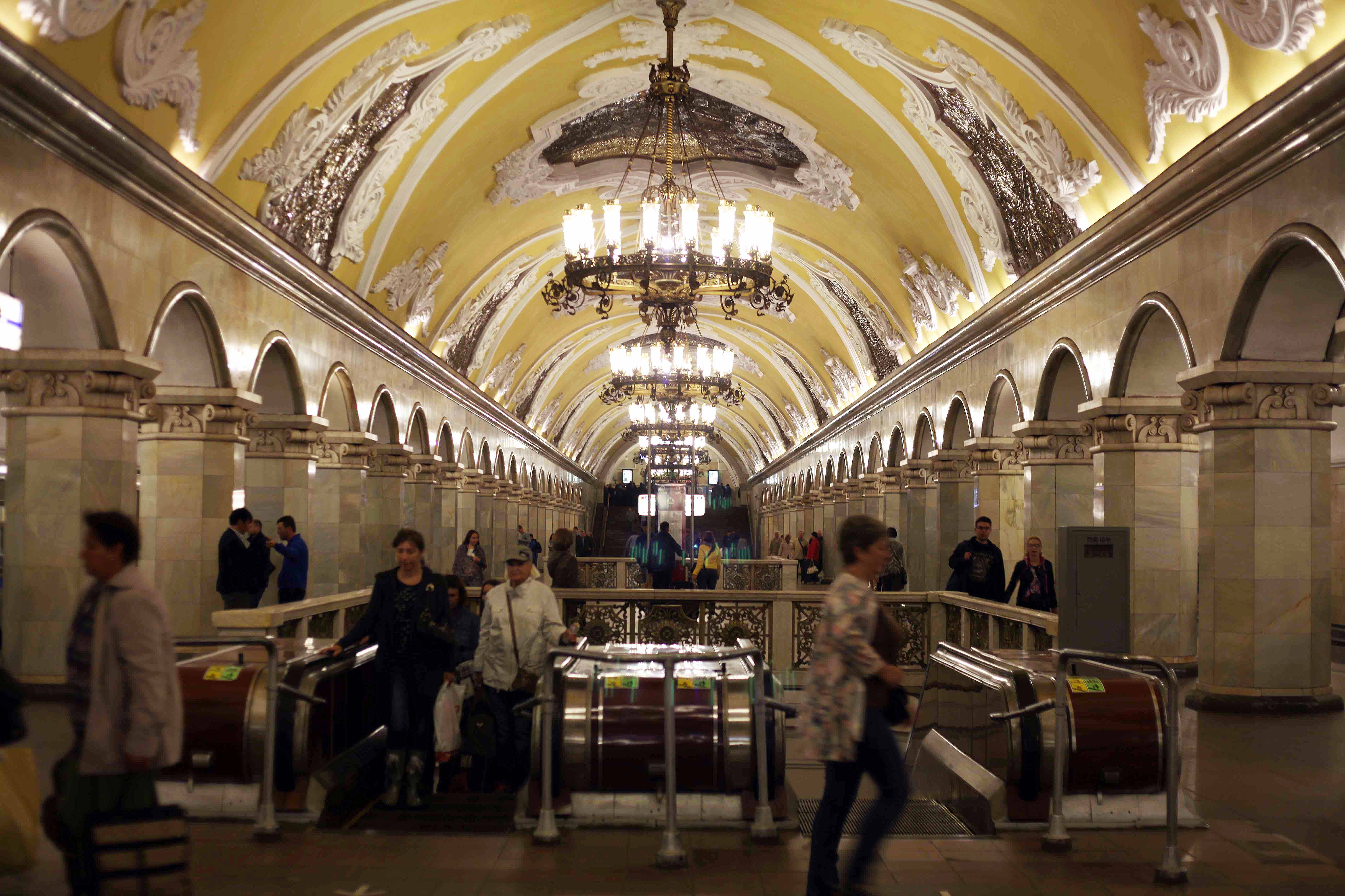 Piece de resistance of the Moscow Metro and winner of the 1938 World Fair in New York is Mayakovskaya. I clash with Muscovites as I stare up at the art deco oval circles that spin the length of the ceiling. Each one contains a scene from 24 hours in the Land of the Soviets.